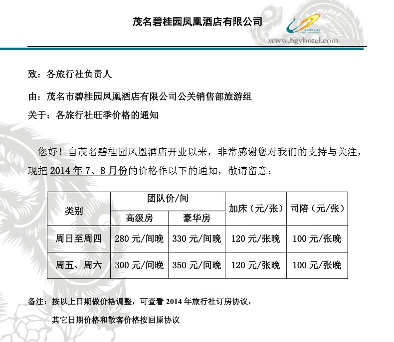 茂名碧桂園鳳凰酒店2014年旺季價格詷整通知