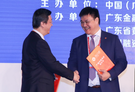 中國人民銀行廣州分行行長王景武(右)為城發(fā)基金副總經(jīng)理王鵬(左)頒發(fā)第六屆金榕獎(jiǎng)之“年度菁英大獎(jiǎng)”