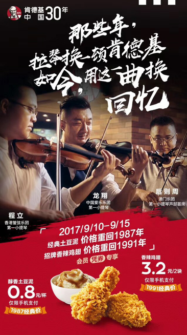 為了慶祝進入中國30周年這一里程碑,肯德基宣布在9月10日至15日期間推出第二輪“經(jīng)典滋味,價格重回當年”活動,所有肯德基WOW會員屆時將有機會以當年的價格購買活動限定產(chǎn)品。肯德基WOW會員將收到電子優(yōu)惠券,以人民幣0.8元購買經(jīng)典土豆泥、3.2元購買招牌香辣雞翅 -- 這分別是1987年和1991年這兩款產(chǎn)品推出時的價格。