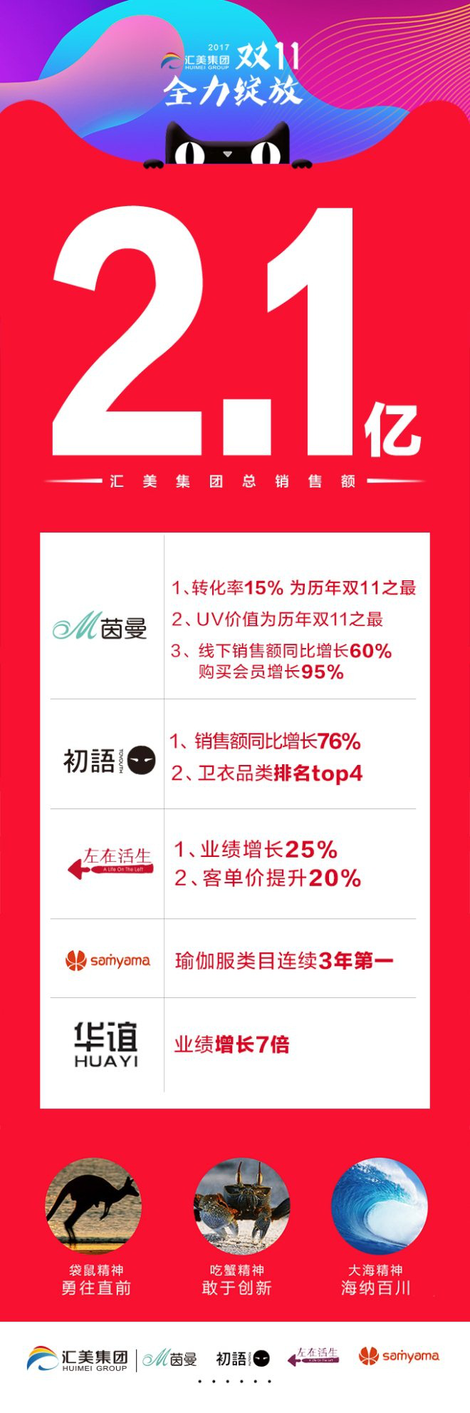 跳轉(zhuǎn)了24小時(shí)的藍(lán)色電子大屏最終定格在2.1億元,同比增長(zhǎng)25%,匯美集團(tuán)交出了2017年雙11的成績(jī)單。每年雙11,匯美集團(tuán)CEO、茵曼創(chuàng)始人方建華總會(huì)提及這句令人印象深刻的話。