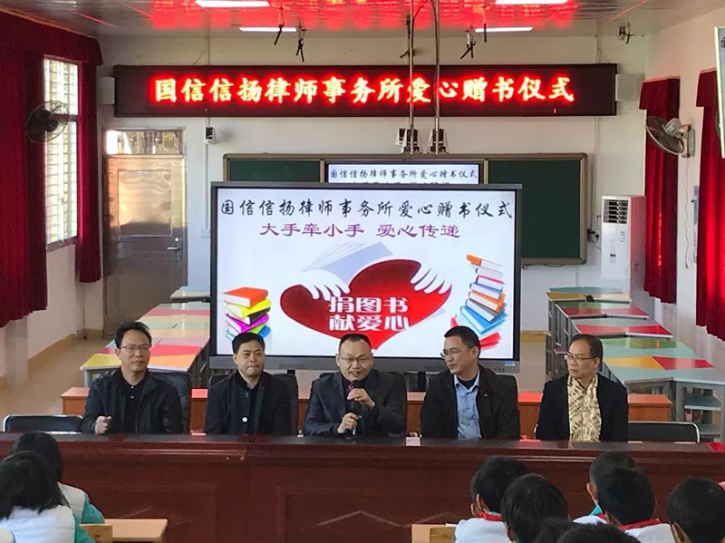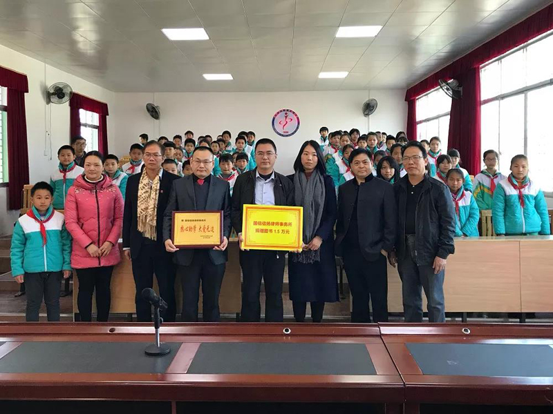 2018年1月12日,國信信揚(yáng)律師事務(wù)所向興寧市大坪中心小學(xué)捐贈圖書1500冊。贈書儀式上,律所代表方金貴律師回憶自己當(dāng)年兒時讀書環(huán)境的艱苦,感慨萬千......。看到中心小學(xué)如此優(yōu)良的師資和完善的學(xué)習(xí)環(huán)境,他殷切希望孩子們能好好珍惜當(dāng)下,一定要努力學(xué)習(xí),并通過閱讀這些書籍,暢飲知識的甘泉,享受讀書的樂趣,吸取知識營養(yǎng),日后能成為國家有用之才。