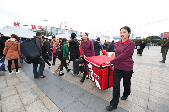 肯德基送餐員工們穿過(guò)人潮如織的廣州火車(chē)站