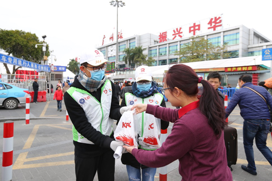 今天上午,溫度更低了。雖然寒風(fēng)凜冽,但無(wú)論是旅客入站口,還是廣場(chǎng)上多個(gè)咨詢點(diǎn)的志愿者們?nèi)绯?jiān)守在崗位上。廣州火車(chē)站旁邊的兩家肯德基餐廳的小伙伴們,帶著新鮮熱辣的豆?jié){,分別來(lái)到公交站旁的服務(wù)點(diǎn)和越秀區(qū)團(tuán)委志愿者休息的大本營(yíng)。這里,有很多像小黃一樣年輕的面孔。本周,廣州火車(chē)站迎來(lái)旅客返鄉(xiāng)的高峰。為了讓100多名志愿者補(bǔ)充體力繼續(xù)堅(jiān)守,肯德基將連續(xù)一周每天兩次送溫暖,以實(shí)際行動(dòng)為志愿者加油,將一份份溫暖和關(guān)懷送給廣州最可愛(ài)的人,感謝他們的堅(jiān)持與付出。