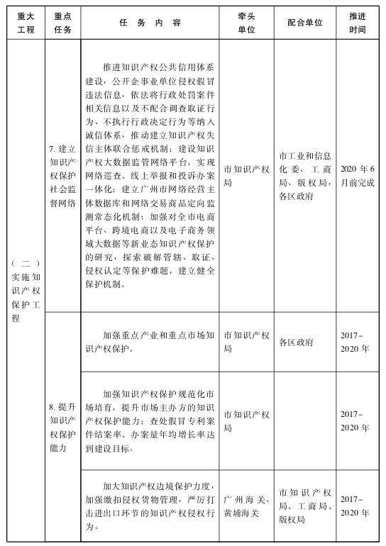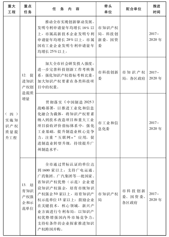 見附件“廣州市創(chuàng)建國(guó)家知識(shí)產(chǎn)權(quán)強(qiáng)市行動(dòng)計(jì)劃重點(diǎn)任務(wù)分工表”。