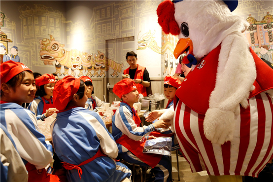 一群來自清遠(yuǎn)市清新縣大巖小學(xué)的30名留守兒童,作為組委會邀請的特別客人,來觀看廟會民俗文化巡演,感受廟會的喜慶歡樂氛圍。逛過了廟會后,他們來到了光明廣場的肯德基。肯德基的姐姐們帶著孩子們玩起了互動小游戲、DIY漢堡……歡樂的時光總是過得很快,吉祥物奇奇向小客人們贈送了兒童玩具和童書,送上了美好的祝愿。