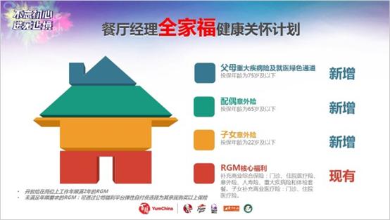 根據(jù)新政,自今年7月1日起,凡在百勝中國餐廳經(jīng)理崗位工作滿兩年的餐廳經(jīng)理(RGM)都能加入“餐廳經(jīng)理全家福健康關(guān)懷計(jì)劃”——該計(jì)劃由公司全資提供,首批預(yù)計(jì)將惠及的餐廳經(jīng)理達(dá)到5,500人,受益的父母、配偶和子女總?cè)藬?shù)預(yù)計(jì)將達(dá)到1.7萬,這也是百勝中國繼去年向餐廳經(jīng)理授予YUMC限制性股票后的又一有力舉措。