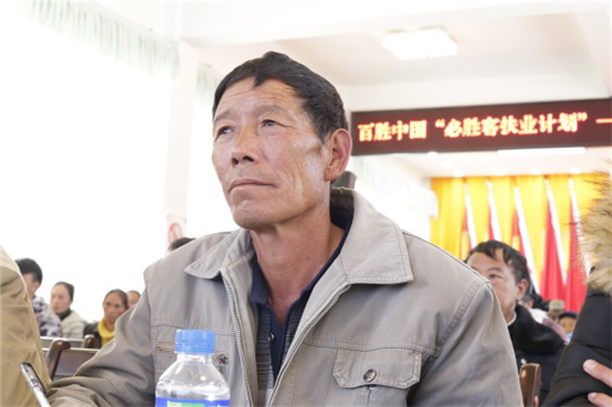 四位農(nóng)戶代表上臺(tái)領(lǐng)取必勝客扶業(yè)計(jì)劃掛歷和教材
