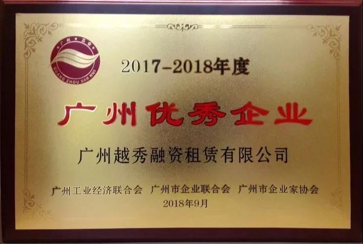 越秀租賃榮獲“2017-2018年度廣州優(yōu)秀企業(yè)”稱號(hào)