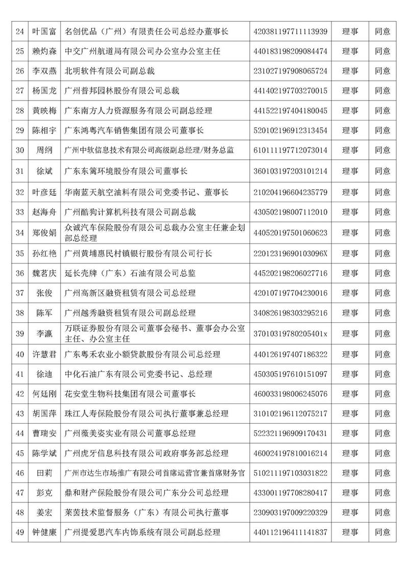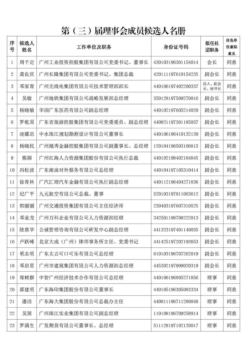根據《廣州市總部經濟協會章程》規(guī)定,經第二屆理事會第八次會議討論通過,提名周千定同志任廣州市總部經濟協會第三屆會長,鄧家青同志任廣州市總部經濟協會法定代表人、副會長兼秘書長,龔良慶同志等16人擬任第三屆理事會副會長,鄭樹群同志等45人任第三屆理事會理事,王曉華同志任第三屆理事會監(jiān)事長。